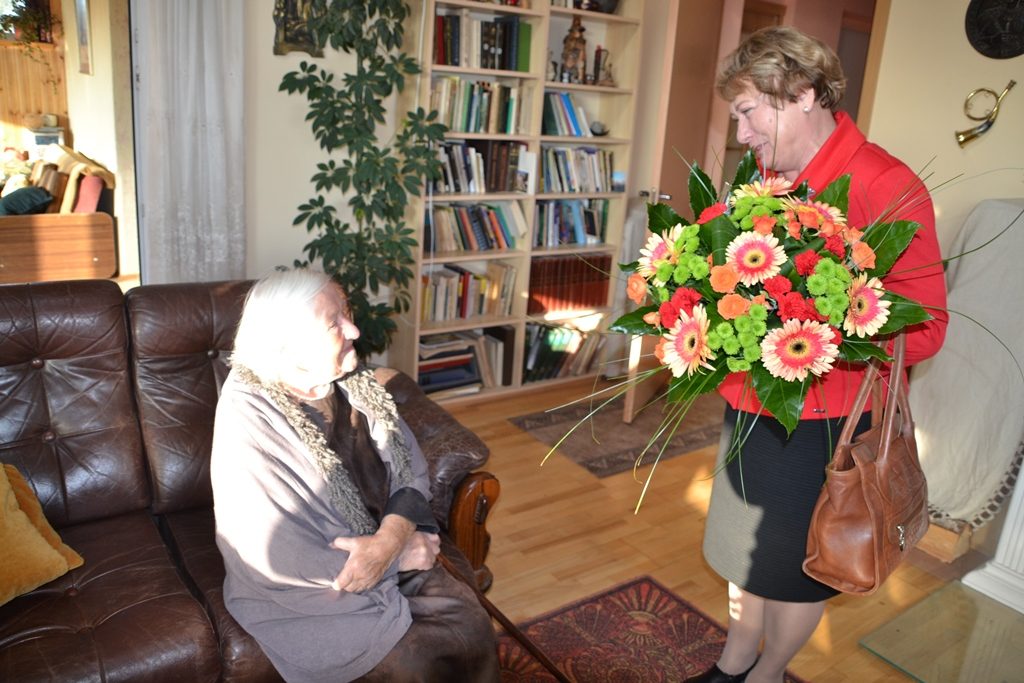 Nemėžio seniūnijos atstovai taip pat pasveikino Magdę su gražia švente ir padovanojo jai saldų pyragą ir didelę puokštę gėlių.