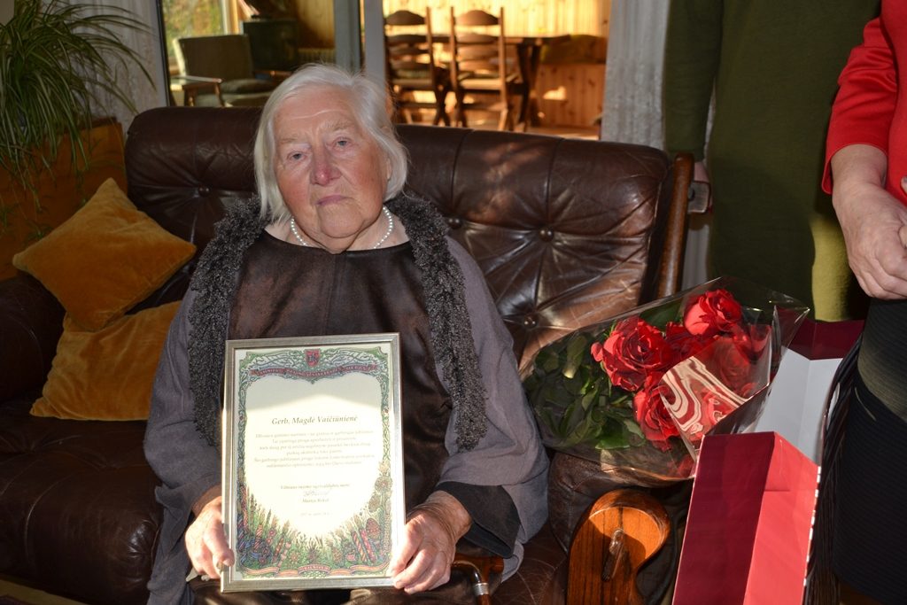 Jubiliejaus proga ilgaamžę pasveikino Vilniaus rajono savivaldybės merė Marija Rekst, linkėdama kuo geriausios sveikatos, stiprybės, artimųjų meilės ir kasdienių džiaugsmų. Merė įteikė Magdei Sinkevičiutei-Vaičiūnienei sveikinimo raštą ir puokštę gėlių, o Socialinės rūpybos skyriaus vedėja Irena Ingelevič atminimo dovaną.