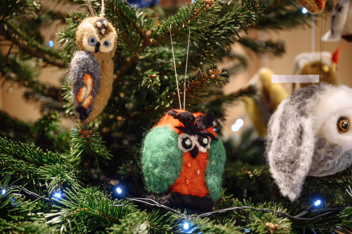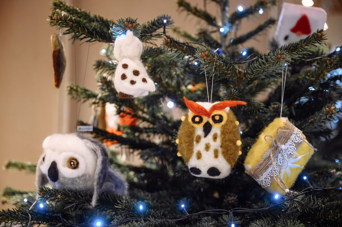 Šių metų eglė papuošta pelėdomis, apuokais ir knygomis – išminties, žinių ir kūrybos simboliais, atspindinčiais dvasinius šių metų akcijos akcentus.