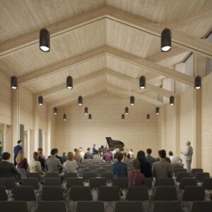 Konkurso nugalėtojai pasiūlė unikalų fasadų ir stogų sprendimą – ažūrą iš degto glazūruoto molio horizontalių elementų. Tai suteiks pastatui lengvumo bei modernumo ir leis įsilieti į aplinką, harmoningai derėdamas medžių kamienų fone. Į Bendruomenės namus bus galima patekti ne tik iš gatvės, bet ir iš vidinių kiemelių – atskirus korpusus sujungs elegantiška stiklinė galerija.