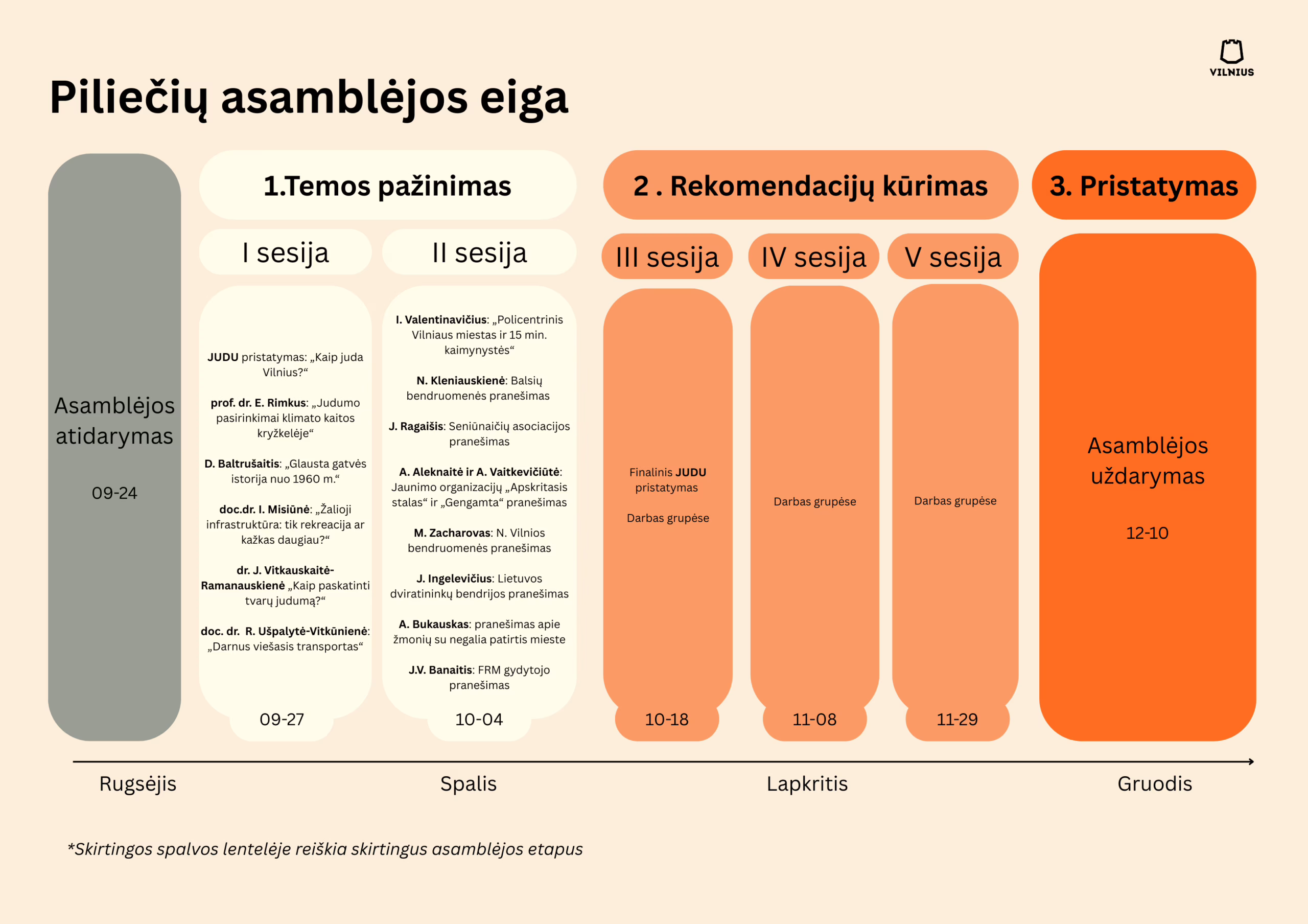 Rugsėjo – lapkričio mėn. vykusių susitikimų metu asamblėjos dalyviai diskutavo ir tarėsi, kaip pasiekti, kad Vilniuje dažniau rinktumėmės keliauti viešuoju transportu, dviračiu ir pėsčiomis. Parengtos rekomendacijos apima daug skirtingų su judumu susijusių temų – nuo miesto planavimo, pėsčiųjų ir dviračių takų, viešojo transporto, eismo organizavimo iki mokyklų tinklo, švietimo, komunikacijos ir kultūros.