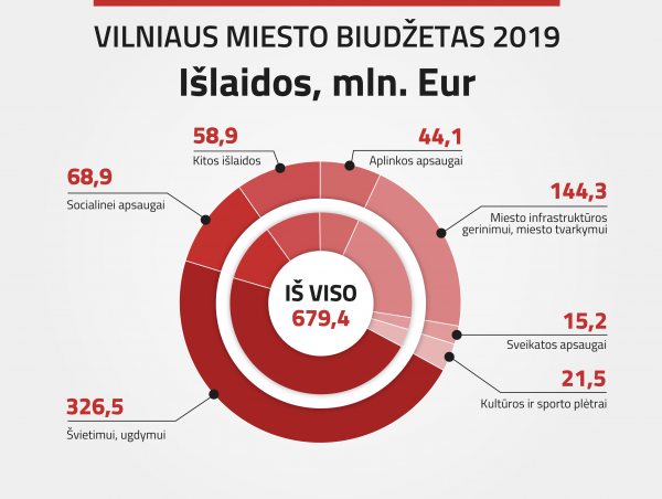 Šiemet Vilniaus miesto biudžete prioritetai išliko panašūs į praėjusių metų ir jiems skirta daugiau lėšų: švietimui ir ugdymui skirta 326,5 mln. Eur, miesto infrastruktūros gerinimui, miesto tvarkymui – 144,3 mln. Eur, socialinei apsaugai – 68,9 mln. Eur, aplinkos apsaugai – 44,1 mln. Eur, kultūrai ir sportui – 21,5 mln. Eur, sveikatos apsaugai – 15,2 mln. Eur, ir kitoms sritims – 58,9 mln. Eur.