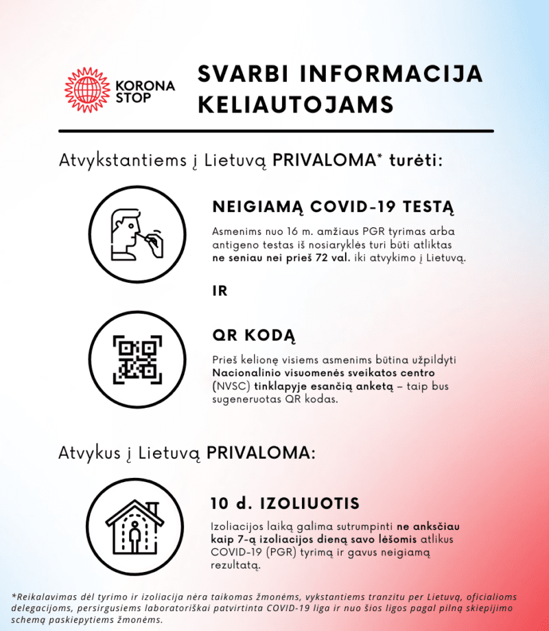 Taip pat primename, kad privalomas tyrimas dėl COVID-19 (PGR tyrimas arba antigeno testas iš nosiaryklės) turi būti atliktas ne seniau nei prieš 72 val. iki atvykimo į Lietuvą ir gautas neigiamas atsakymas, kurį prieš kelionę privaloma pateikti vežėjui. Testą dėl COVID-19 būtina turėti asmenims nuo 16 metų amžiaus imtinai. Pažymėtina, kad serologinių antikūnų tyrimų atsakymas nepripažįstamas.