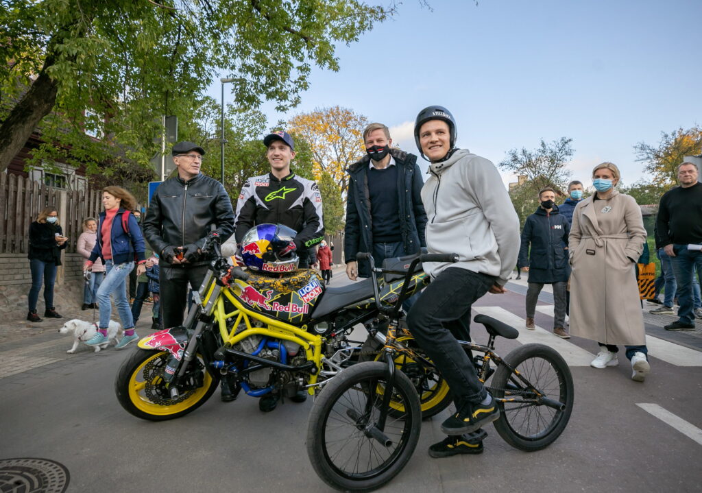 Kelio dangą išbandė ir ekstremalaus sporto žvaigždės. Žymiausias Lietuvos BMX dviratininkas David Budko ir daugkartinis Europos motoakrobatikos čempionas bei Red Bull atletas Aras Gibieža stojo savo ratuotom transporto priemonėm vienas šalia kito ir pravažiavo gatvę ant vieno rato.
