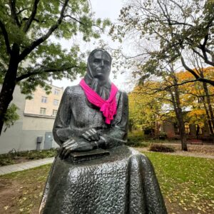 IWAV ir „Sužydėjusi viltis“ iniciatyvos pirmininkė Ugnė Kukliauskaitė-Kairienė sako, kad rožinėmis atributikomis papuoštos miesto skulptūros siunčia svarbią žinutę apie moterų sveikatos priežiūros būtinybę.