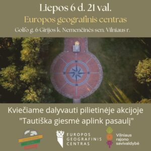 21.00 val. Europos geografiniame centre (Golfo g. 6, Girijos k., Nemenčinės sen., Vilniaus r.) vyks pilietinė akcija „Tautiška giesmė aplink pasaulį“.