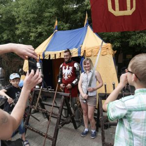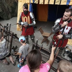 Žurnalistai Eglė Račkauskaitė ir Remigijus Pakėnas kalbino inscenizacijos dalyvius bei žiūrovus. „Viduramžių pasiuntinių“ riteris Dominykas papasakojo, jog jo dėvimų šarvų svoris – apytiksliai 35 kilogramai, 3 kg iš jų sudaro šalmo svoris, o 1,5 kg – kalavijo (Viduramžiais kalavijas neturėjo būti sunkus, svarbiausia buvo sugebėti greitai padurti ar nukirsti priešininką). Inscenizacijos riteris sakė, kad apsirengti šarvus užtrunka panašiai valandą, bet turint gerą ginklanešį galima ir greičiau – per 40 minučių. Jis teigia, jog, nepaisant didžiulio svorio, šarvai judesių nevaržo, nes yra pritaikyti ir pagaminti specialiai jam. Tokių šarvų kaina neatskleidžiama, tačiau juokaujama, kad išeitų neblogas automobilis.