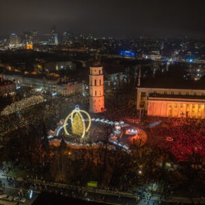 „Visi savo šeimose turime skirtingų tradicijų, tačiau tikiu, kad mus visus tikrai vienija ši – eglutės puošimas žaisliukais. Tai ypatingas momentas, į kurį kasmet įsitraukia visa šeima, skirtingos kartos, bendruomenės. Šventiniu laikotarpiu kviečiame vilniečius bei miesto svečius ir toliau puoselėti senas bei kurti naujas tradicijas ir patirtis“, – susirinkusius į Kalėdų eglės įžiebimo šventę sveikino Vilniaus meras Valdas Benkunskas su žmona Vismante Benkunskiene.