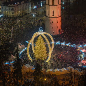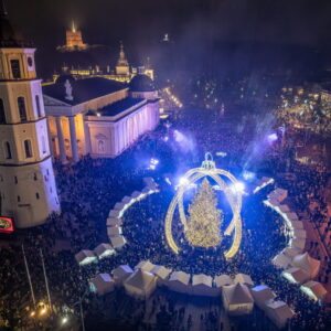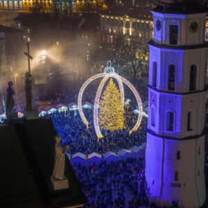 Penktadienio vakarą sostinės Katedros aikštėje įžiebta pagrindinė Vilniaus Kalėdų eglė. Natūralų 15 m aukščio medį šiemet supa stilizuota milžiniško burbulo formos žaisliuko kompozicija, į kurios vidų galima įeiti ir eglutę apžiūrėti iš arčiau.