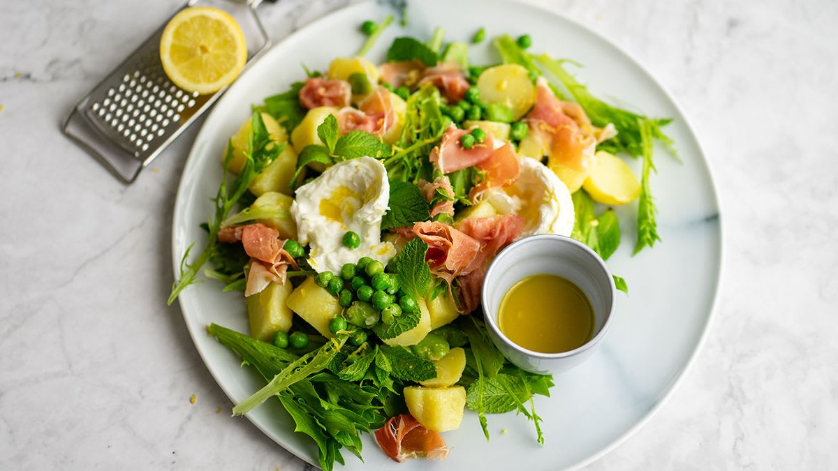 Bulves išvirkite ir supjaustykite gabaliukais. Mocarelą suplėšykite į vidutinio dydžio gabaliukus. Salotų lapus nuplaukite ir nusausinkite. Vytintą kumpį supjaustykite griežinėliais. Žirnelius ir pupeles trumpai apvirkite arba atitirpinkite. Į dubenį sudėkite visas salotų sudedamąsias dalis. Padažui sumaišykite garstyčias, citrinos sultis ir alyvuogių aliejų. Užpilkite padažą ant salotų ir lengvai išmaišykite.