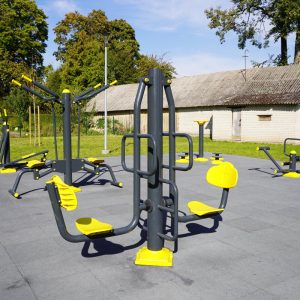 Taip pat šalia sumontuota vaikų žaidimų aikštelė su lipynėmis, sūpynėmis ir čiuožykla, 110 kv. m treniruoklių aikštelė su 5 lauko treniruokliais sportui gryname ore.