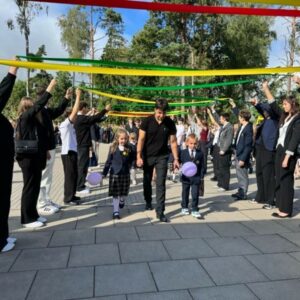 Šventinę nuotaiką dar labiau pakylėjo gimnazijos direktorės sveikinimas ir bendruomeniškai sugiedotas gimnazijos himnas. Ypatinga tradicinė akimirka – pirmokų palydėjimas į jų pirmąją pamoką – simbolizavo naujos kelionės pradžią, kupiną atradimų, draugystės ir bendrystės.