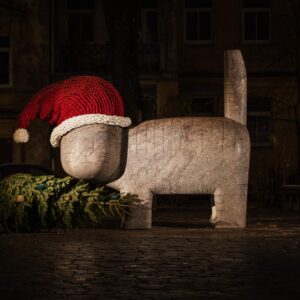 Vilniaus skulptūros nuotaikingai pasipuošė Kalėdoms (galerija)
