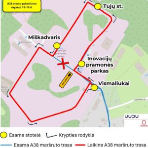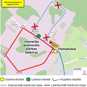 Taip pat nuo trečiadienio (rugsėjo 18 d.) dėl Vismaliukų g. vyksiančių nuotekų tinklų remonto darbų, laikinai keisis 38 autobuso maršruto trasa. I-uoju remonto etapu, rugsėjo 18–19 d., autobusai važiuos apylanka, tačiau stos visose maršruto stotelėse (žr. Schemą žemiau).