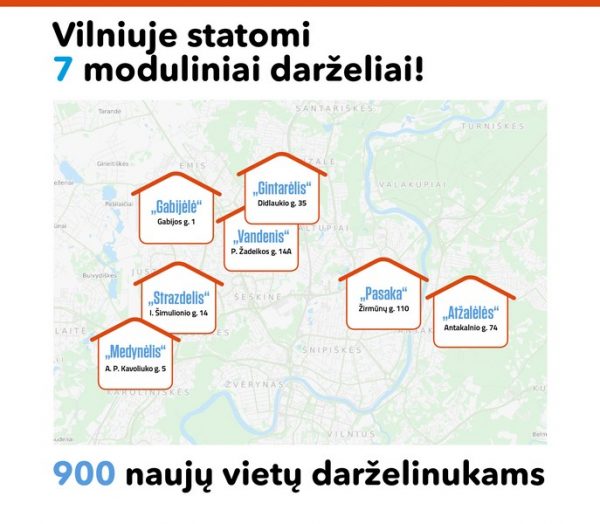 Nauji moduliniai darželiai bus statomi ten, kur šiuo metu labiausiai trūksta vietų: prie lopšelių-darželių „Pasaka” (Žirmūnų g. 110, Žirmūnuose), „Gabijėlė” (Gabijos g. 1, Pašilaičiuose), „Vandenis” (P. Žadeikos g. 14A, Fabijoniškėse), „Atžalėlės” (Antakalnio g. 74, Antakalnyje) , „Gintarėlis” (Didlaukio g. 35, Baltupiuose), „Strazdelis” (I. Šimulionio g. 14, Karoliniškėse) ir „Medynėlis”(A. P. Kavoliuko g. 5, Karoliniškėse).